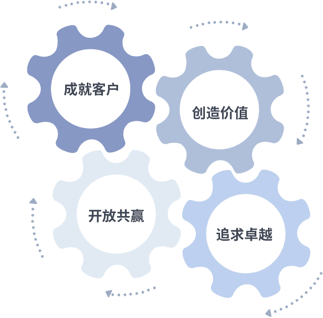 成就客户是一切决策的出发点,,创造价值是衡量所有工作的标准,,,追求卓越是我们做事做人的态度,,开放共赢是我们的格局也是最终的结果。。。价值观的齿轮环环相扣,,,推动着组织里的每个人不断向前。。。