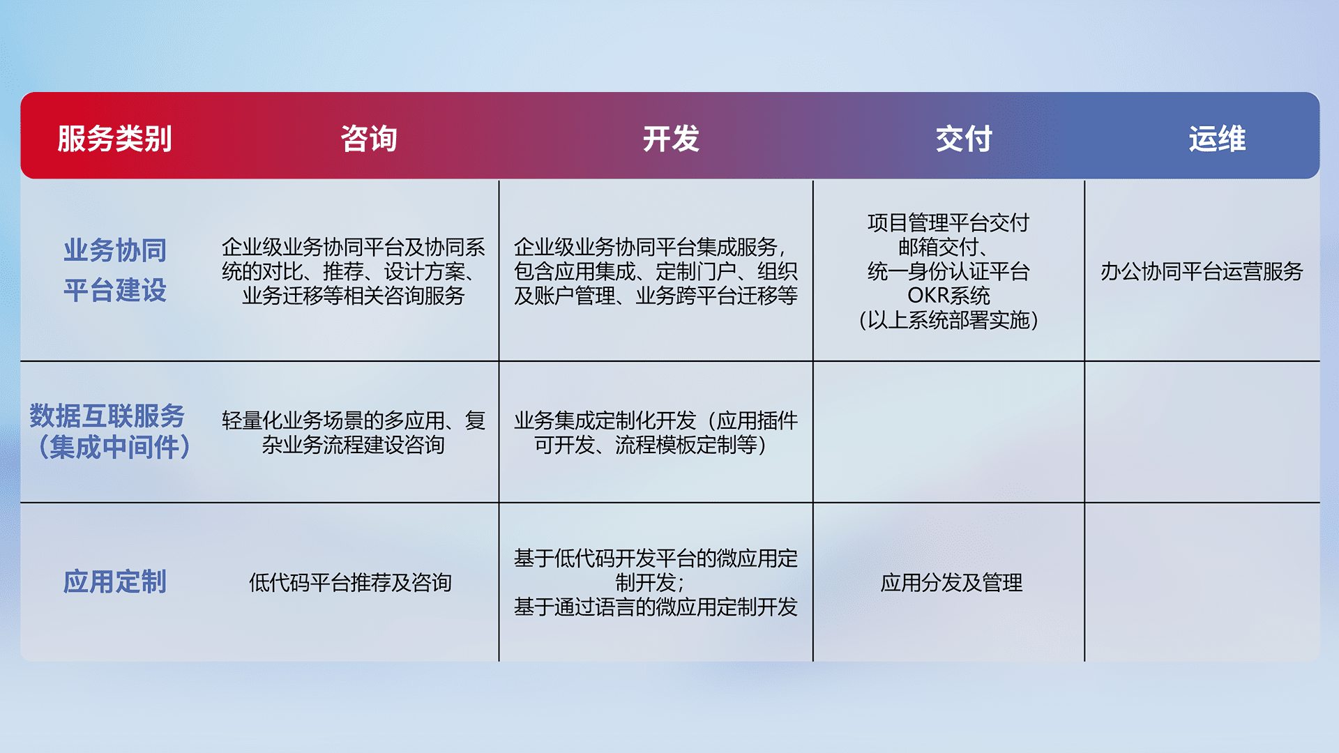 针对钉钉、、企微、、、、IDaas等平台级产品提供产品的规划、、方案、、、、交付、、、定制化开发等服务,,,实现如统一协同办公、、、智能客户服务、、、混合会议管理、、、、智能数据查询、、、等业务场景,,,实现数字化转型。。